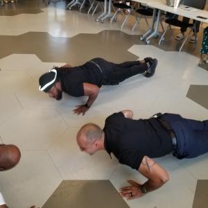 DETECTIVE SANTIAGO FROM UNION TOWNSHIP COMMUNITY POLICING SPEAKS @ SAFESPACE NJ COMMUNITY EVENT FRIENDLY COMPETITION: SAFESPACE NJ GUEST PHYSICAL THERAPIST WINSTON SAINT AND UNION TOWNSHIPS's COMMUNITY POLICING's DETECTIVE SANTIAGO GO PUSHUP TO PUSHUP SAFESPACE NJ AUDIENCE MEMBERS